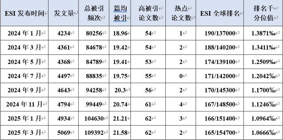 材料科学学科全球排名165位,较上期提升了1位;ESI排名千分位由1.096‰提升至1.067‰。近一年来,我校ESI材料科学学科的全球排名处于稳步上升态势。