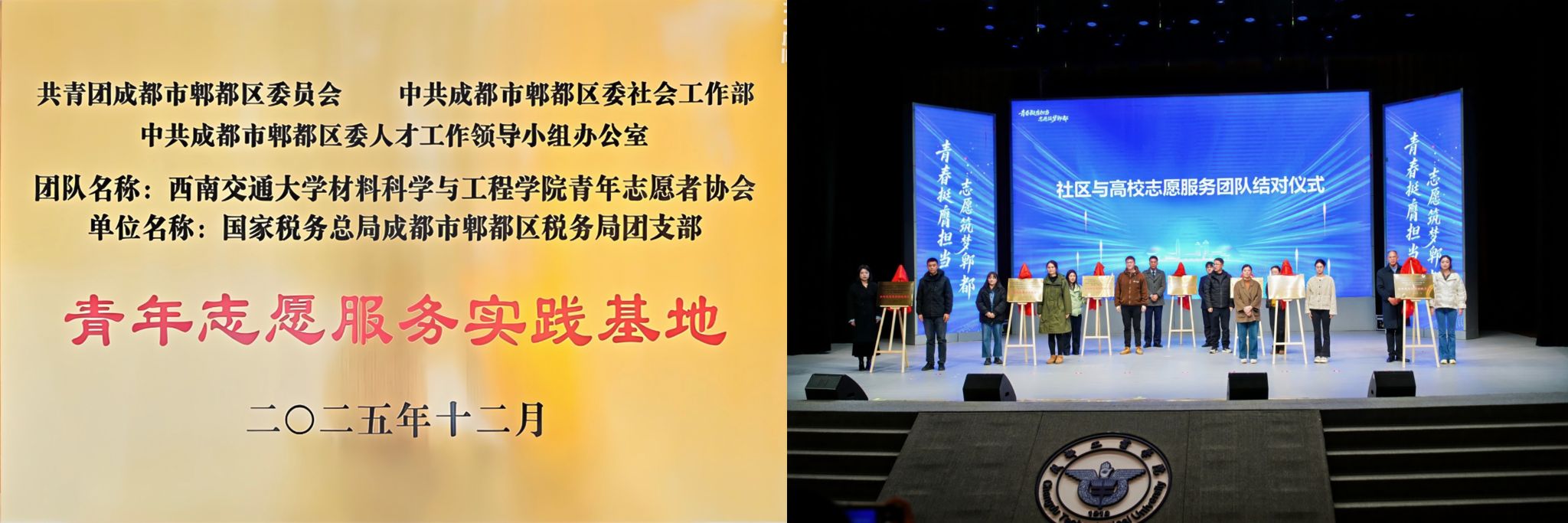 学院高度重视实践育人平台建设,推动校地合作向制度化、实体化发展。在成都市郫都区首届青年志愿者服务项目大赛决赛路演活动的社区与高校志愿者服务团队结对仪式上,学院与国家税务总局成都市郫都区税务局共同为“青年志愿服务实践基地”揭牌。该基地的建立,标志着双方合作进入了有固定场所、有运行机制、有常态项目的新阶段,成为汇聚资源、开展活动、深化研究的重要枢纽,为后续持续开展劳动实践、专业研学、志愿服务提供了坚实保障,是“五维协同”体系落地生根的关键物理依托。