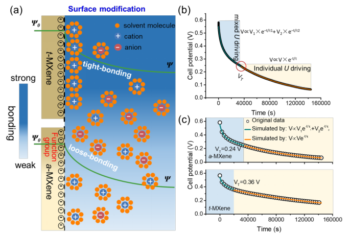 图1. 揭示和调控Ti3C2Tx MXene基超级电容器的自放电效应。(a) 不同的紧密键合模型的示意图。(b) 不同的键合模型导致了混合自放电机制。(c) 通过调控界面化学,实现调控自放电过程的策略。