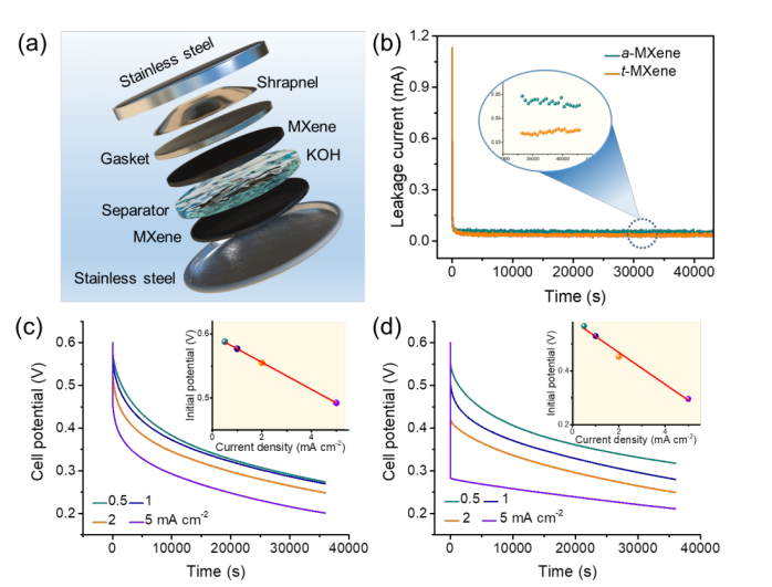 图2. Ti3C2Tx MXene基超级电容器的自放电行为。(a) MXene基超级电容器的示意图。(b) 漏电流测试。(c) a-MXene和(d) t- MXene基超级电容器在不同的电流密度下的开路电位随时间的变化。