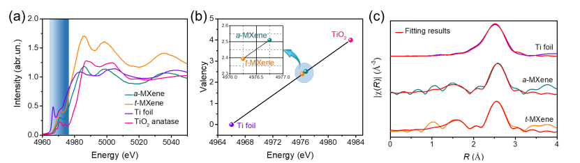 图4. Ti元素的X射线吸收精细结构。(a) a-MXene和t-MXene以及Ti箔和TiO2的Ti K-edge XANES谱。(b)通过参考Ti箔和TiO2的Ti K-edge能量转移,估算a-MXene和t-MXene中的Ti元素的平均氧化态。(c) a-MXene与t-MXene对应的EXAFS R空间拟合曲线。
