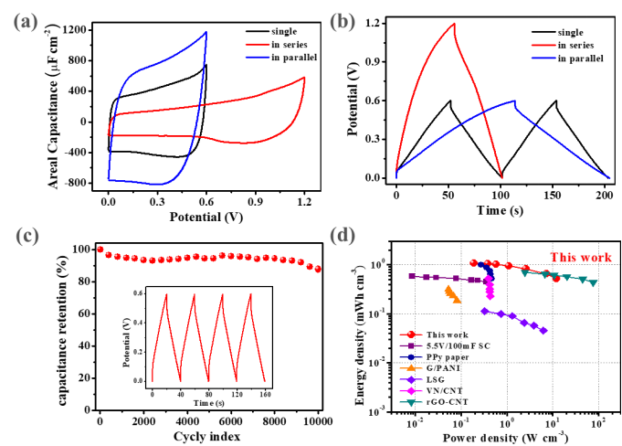 图4 (a) 单个器件、串联、并联的器件在10 mV s-1的CV曲线;(b) 单个器件、串联、并联的器件的GCD曲线;(c) 芯片式MSCs在电流密度为10 μA cm-2的循环性能,插图给出的是循环过程中的GCD曲线;(d) 芯片式MSCs的拉贡(Ragone)图谱,通过与rGO-CNT、VN/CNT、PPy、LSG等进行比较,可以看到MXene基芯片式MSCs同时具有较高的能量密度和功率密度,展现出良好的电化学存储能力。