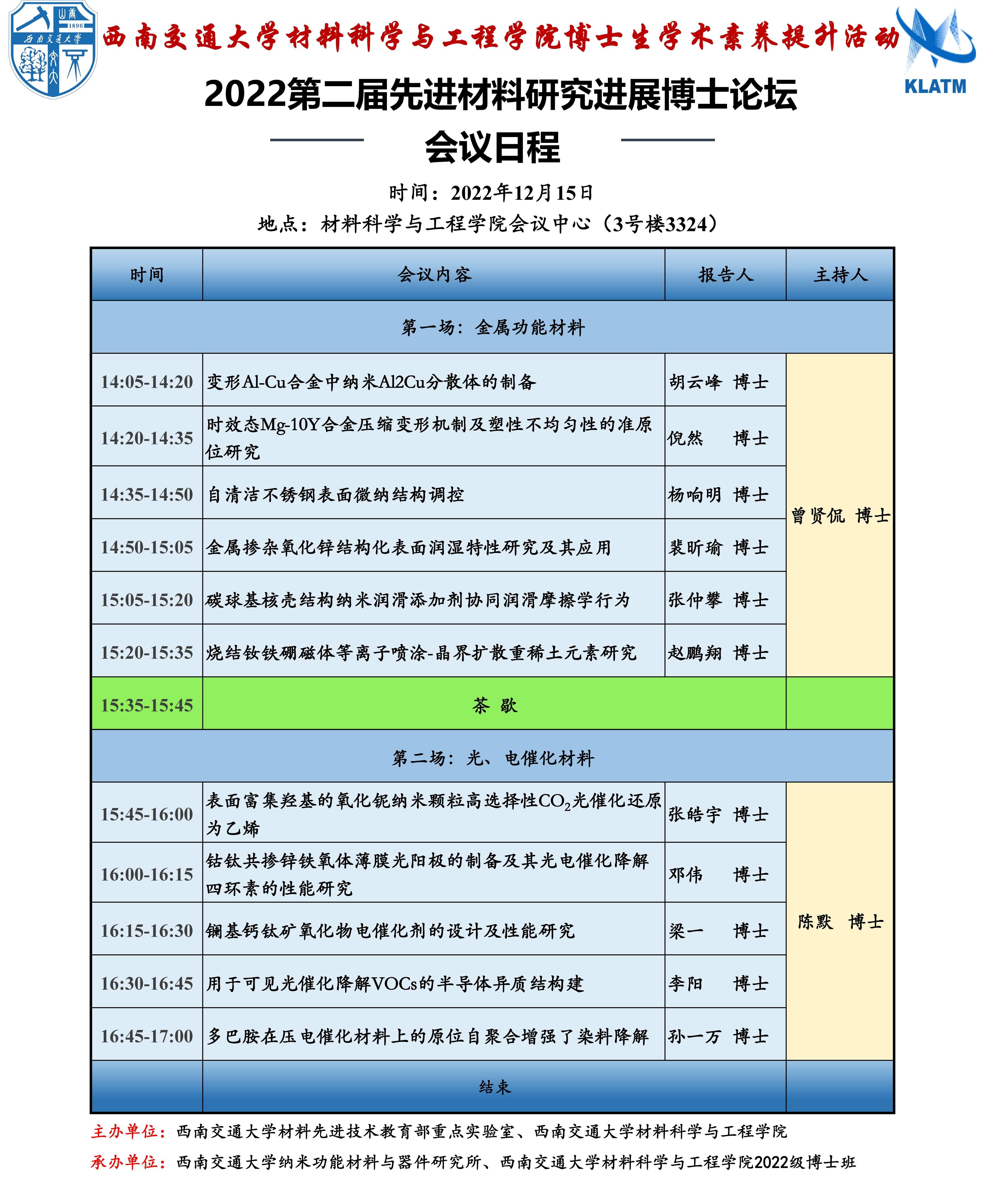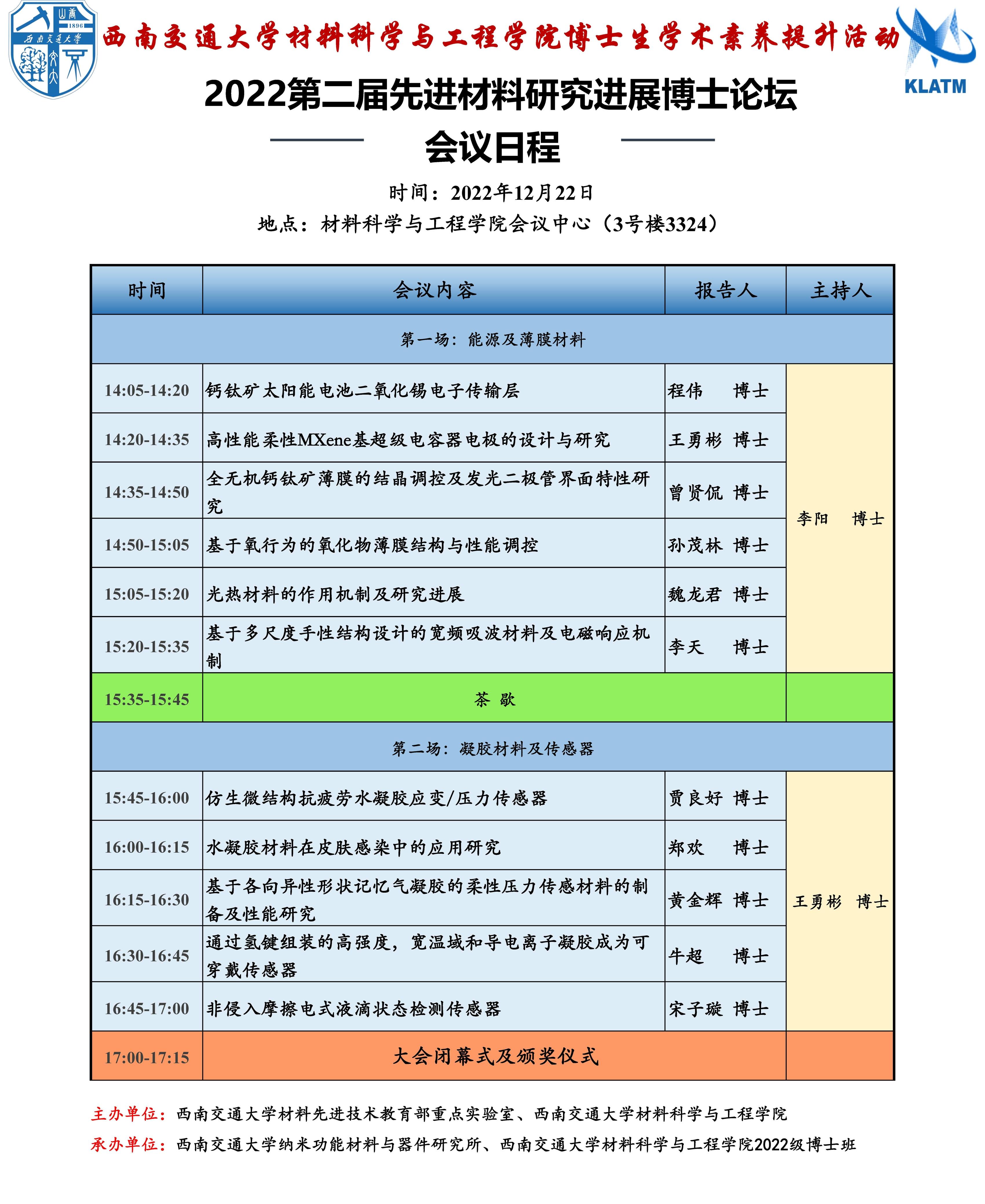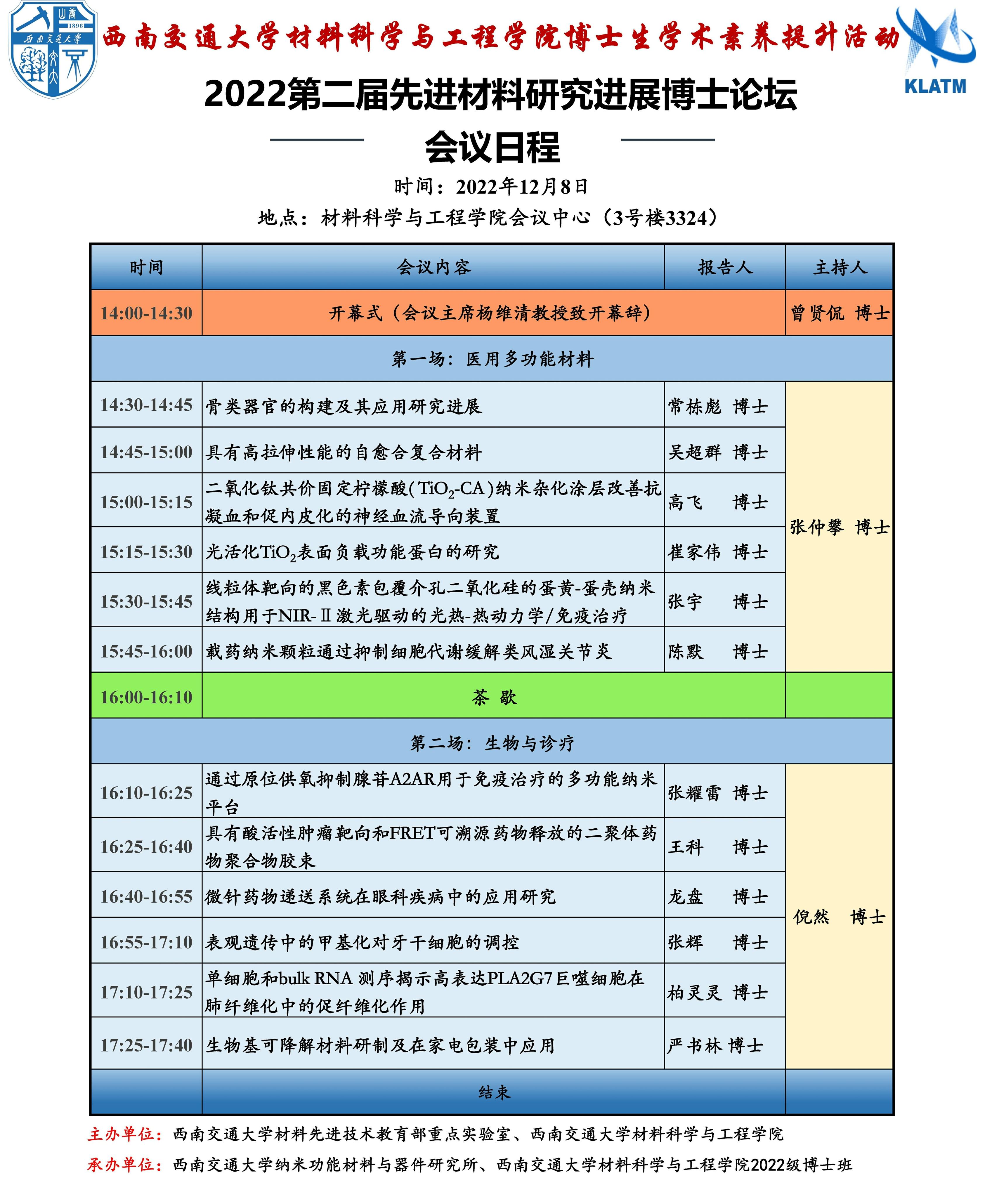 2022级博士研究生进行主题报告,报告将围绕医用多功能材料,生物与诊疗,金属功能材料,光、电催化材料,能源及薄膜材料,凝胶材料及传感器多方面的学科前沿交叉问题展开,旨在促进材料科学学科发展、合作与创新,激发思想碰撞和产学研合作,拓宽包子漫画