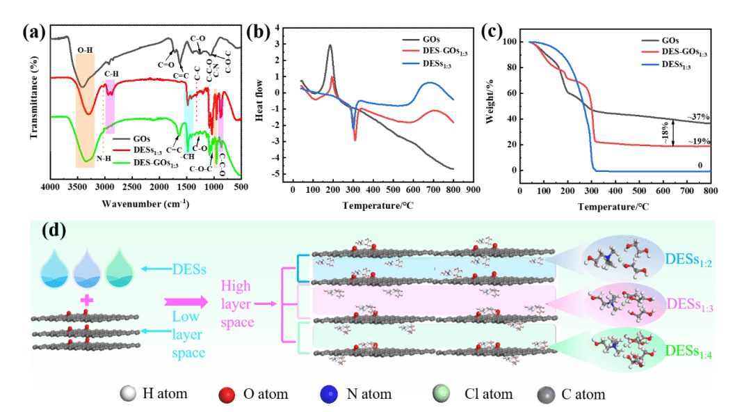 图1 (a)GOs、DES-GOs1:3和DESs1:3的FTIR光谱,(b)DSC和(c)TGA曲线,(d)DES-GOS的制备机理图