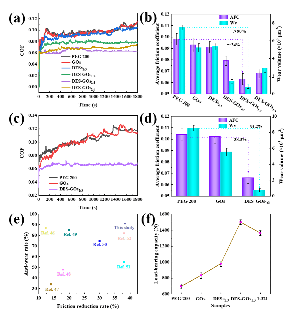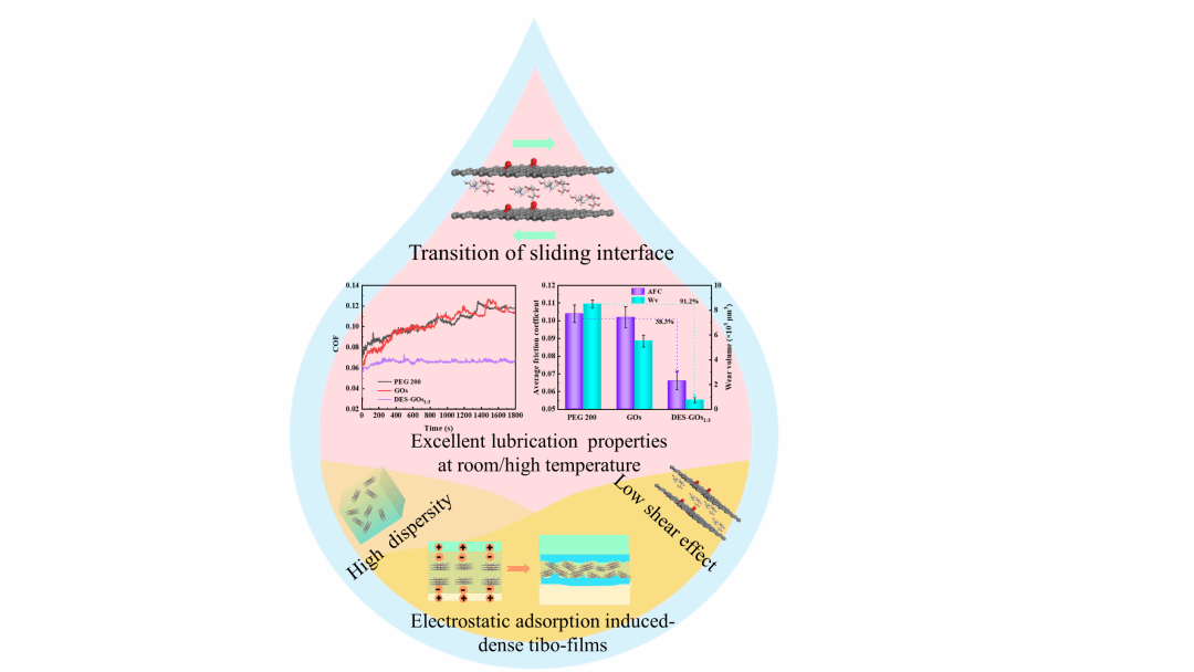 材料服役行为研究团队樊小强等以低共熔溶剂(由氯化胆碱和乙二醇制成)插层氧化石墨烯(DES-GOs)构筑了三明治结构的复合润滑添加剂,低共溶溶剂(DESs)与氧化石墨烯纳米片间以氢键网络链接;在PEG 200中分散稳定性优异,120 d无沉淀;导电性能优异的DES-GOs添加后,其平均摩擦系数和磨损体积比PEG200分别降低了38.3%和91.2%,这归功于功能化石墨烯的高分散稳定性、致密摩擦膜的形成、弱的层间剪切效应。