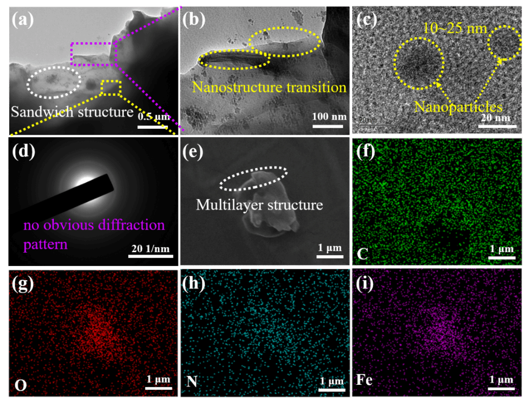 图4(a-c)DES-GOs1:3磨损碎屑的TEM图像,(d)电子衍射图,(e)SEM图像和(f-i) EDS映射(C, O, N, Fe)