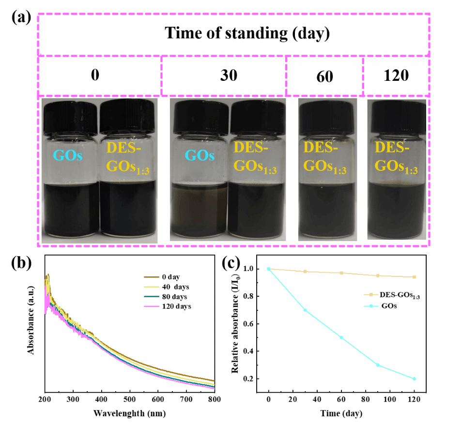 图2 GOs和DES-GOs1:3增强PEG200在不同静置时间下的(a)光学图像、(b)紫外-可见吸收光谱、(c)相对吸光度