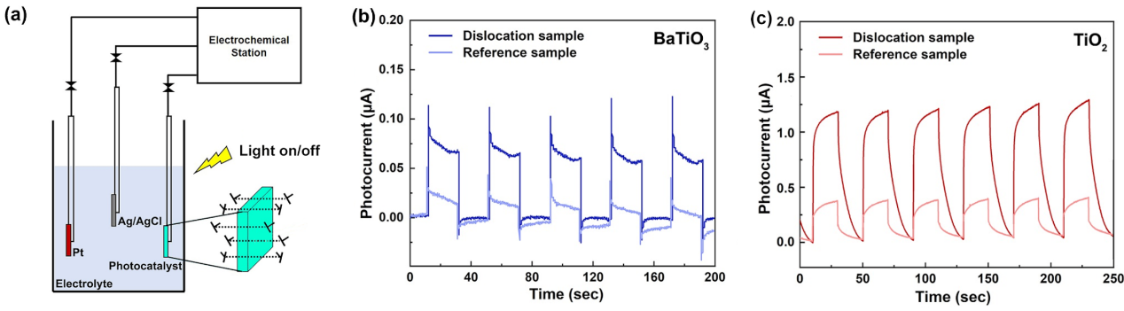 在此次研究中,合作研究团队通过在高温下施加单轴压缩载荷,成功向钛酸钡和二氧化钛块状单晶中引入了主要沿 <001> 和 <100> 取向的位错。实验发现两种金属氧化物的光学性能未明显受到位错的影响。但位错的引入增强了二者的载流子分离/转移能力,有效地抑制了光生电子-空穴对的复合。位错作为光生电子从光催化剂内部到表面迁移的快速通道,本质上提高了光催化剂表面上的光生电子的数量,从而加强了电子主导的光催化反应。因此,这些富含位错的钛酸钡和二氧化钛单晶样品比没有位错的样品具有更强的光催化过氧化氢合成能力。尽管没有牺牲剂的加入,二者的过氧化氢的产率甚至超过了已报道的研究中的多种方法。该研究为调控光催化剂中一维缺陷来促进光催化反应的相关研究开辟了新的途径,使位错工程成为一种颇具希望的可持续调控手段。