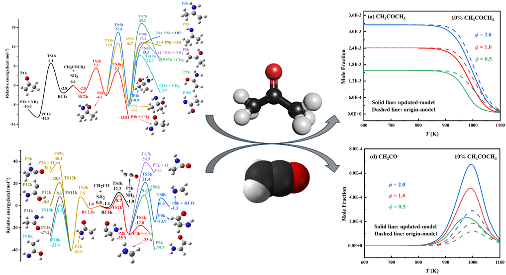 丙酮和乙烯酮是碳氢化合物和含氧化合物燃烧的重要中间体,通过对于丙酮和乙烯酮与氨基的交叉反应动力学研究,我们获得了准确的反应动力学数据(图1),可为完善碳氢氧燃料与含氮燃料的燃烧反应网络提供指导和借鉴。并将得到的准确动力学数据应用到丙酮/氨掺混的动力学模型中,完善了NH3与C/H/O燃料混合燃烧的核心机理的构建。相关成果以“Theoretical reaction kinetics predictions for acetone and ketene with NH2 radicals: Implications in acetone/ammonia kinetic modeling”为题发表在Energy上。