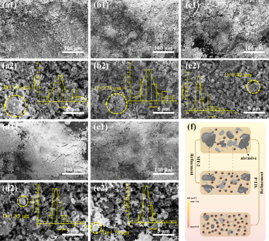 图4. 磁控作用下磨屑微观形貌的演变过程. (a) NT, (b)MT-1, (c) MT-2, (d) MT-3, (e) MT-4, (f)磁场刺激下磨屑细化示意图。