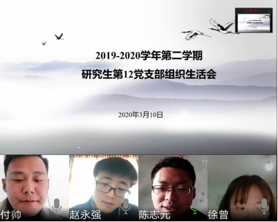 研究生第十二党支部全体党员在党支部书记的带领下,于云上召开2019-2020学年第二学期第一次组织生活会。