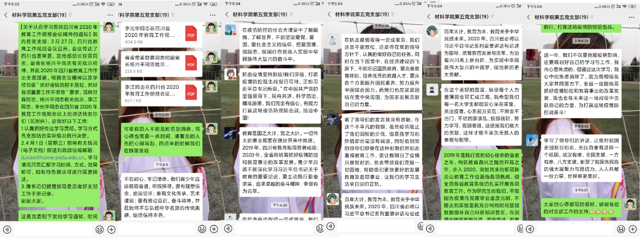 研究生第五党支部于2020年3月30日下午3:00开展了线上学习贯彻四川省2020年教育工作视频会议精神的线上主题教育活动, 本次线上自主学习的主题为“共同战疫不放松,紧抓工作不懈怠”,本次活动由党支部书记卢敏同志主持,支部全体党员参与了此次线上组织生活。