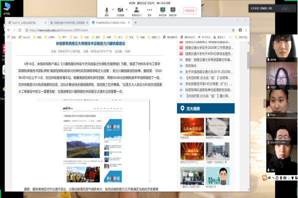 接着梁喻嘉分享了近期学院科研工作取得重大成果的消息,如“交大焊接技术助力川藏铁路建设”、“周祚万教授团队获2019年度四川省科学技术进步一等奖”等,激励老师和同学们努力前行。