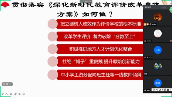 会议围绕中共中央、国务院印发的《深化新时代教育评价改革总体方案》开展,从《总体方案》提出的背景,过程和意义,再到坚持立德树人、坚持问题导向、坚持科学有效、坚持统筹兼顾、坚持中国特色的主要原则,明确教育改革的目的和重点任务,以及如何组织实施。大家都深刻感受到党中央对于教育的重视,教育是国之根本,身处教育环境的我们,正是这次总体方案的直接接收人。对此大家进行了热烈的探讨。