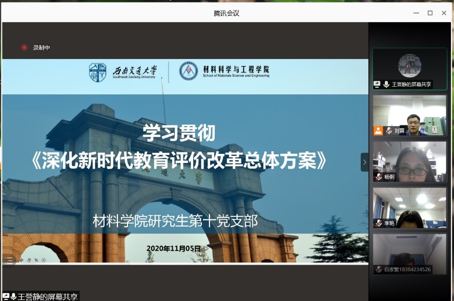 会议上,支部书记王誉静同志带领支部成员仔细学习了《深化新时代教育评价改革总体方案》内容,并结合官方媒体、“学习强国”等平台上相关专家的论述,对文件内容进行原汁原味的学。会上,还就习近平总书记关于教育的重要论述进行拓展学习。积极引导学生党员同志深入理解在新时代的教育背景下,青年学生、青年党员更应该树立科学的成才观念,志存高远、脚踏实地、学好知识,打好基础,增长才干,成为德智体美劳全面发展的社会主义建设者和接班人,为中华民族伟大复兴贡献自己的智慧和力量。作为研究生党员,不能唯论文作为发展方向的评判标准,在科研生活中,应当坚守自己的信仰、笃定笃行,全面发展,珍惜时间,努力奋斗,实践科学方法,强化学术能力,为营造教育发展良好环境贡献绵薄力量。欲修学,先立身,重操守、重品行、重修养,立德树人,全面发展才是新时代的人才成长目标和教育发展方向。