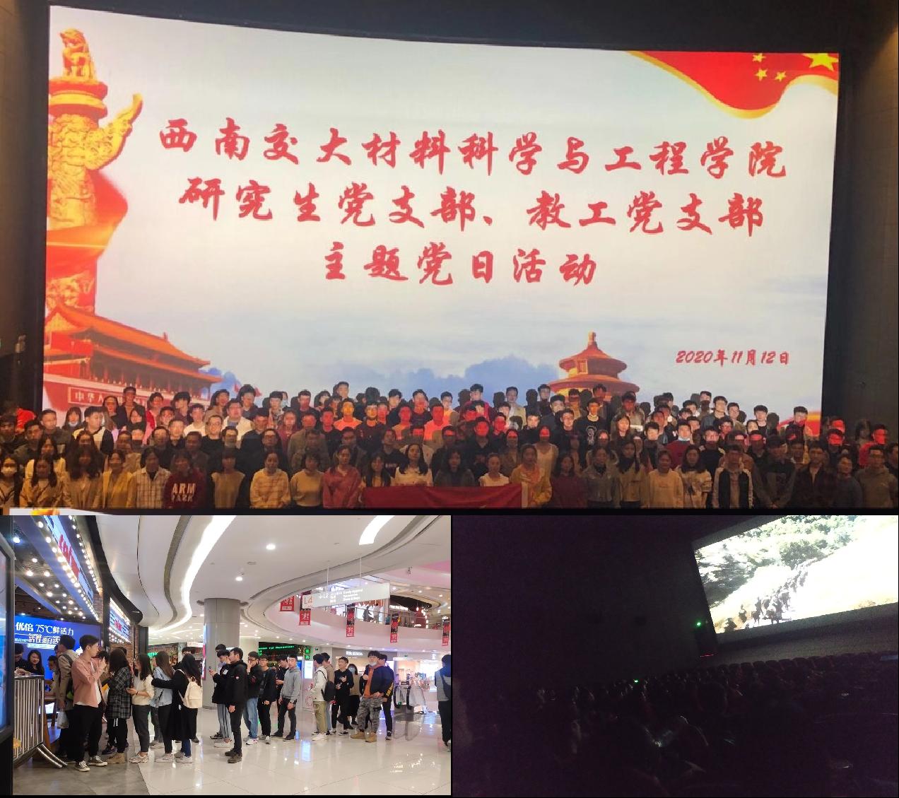 本次活动由学院党委组织,各支部协同配合开展。晚6点,本支部由支部书记卢敏同志组织支部党员同志有序抵达电影院排队签到领票,观影前参加本次活动的全体成员在荧幕前合影留念。7点电影准时播放,在观影前卢敏同志向支部党员提出观影要求,每人观影结束需要发表观影感言,支部同志带着任务认真观影,在看到志愿军战士在艰苦卓绝的环境下一次次补桥,在敌军的炮火下以血肉之躯架起那座堪比生命线的木桥时,许多同志都为之动容而纷纷落泪,志愿军战士展现出的英勇顽强、舍生忘死的革命英雄主义精神不仅是对大家心灵的洗礼,也是一次精神的教诲。