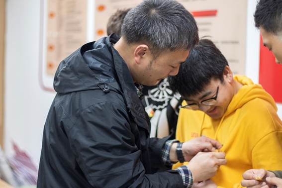 座谈结束后,党支部在x2127b党团活动室为新发展入党同志举行佩戴党徽仪式。学院党委书记陈勇、党委副书记章春军,辅导员老师梁喻嘉、罗丹为同志们佩戴党徽,并叮嘱同志们要在服务学院师生的各项工作中践行入党初心。