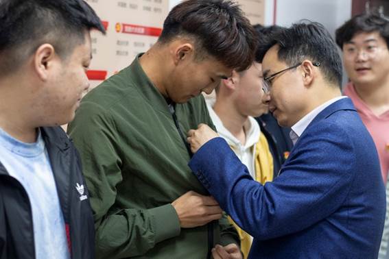 辅导员老师梁喻嘉、罗丹为新发展党员同志佩戴党徽