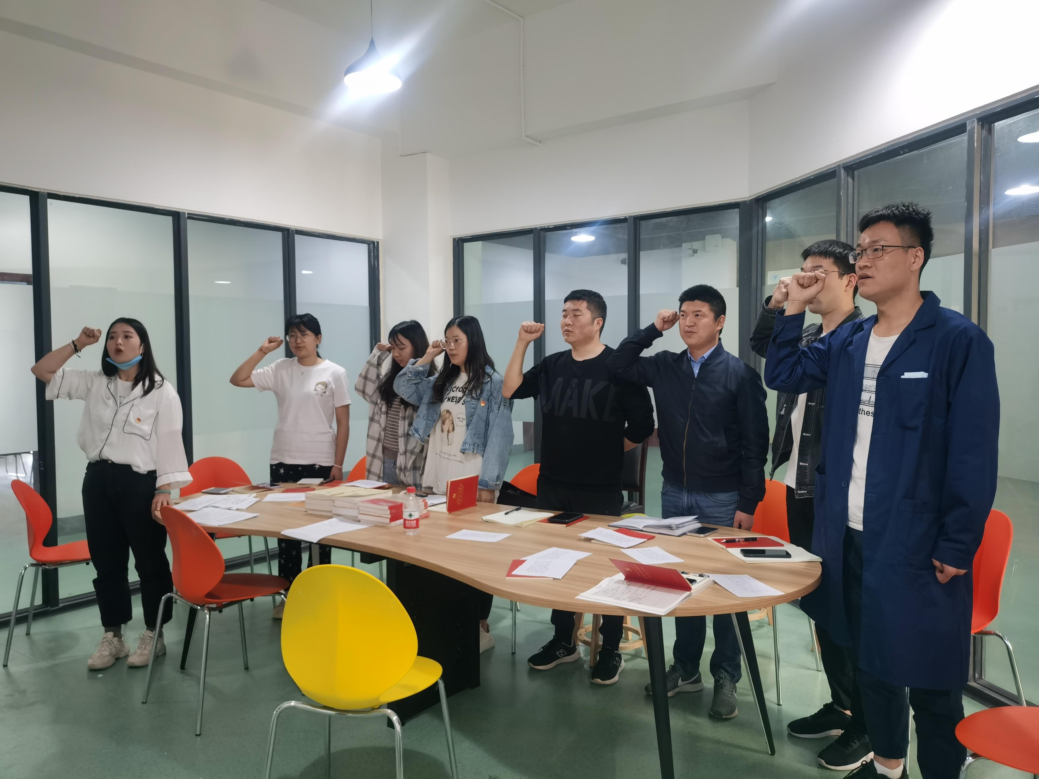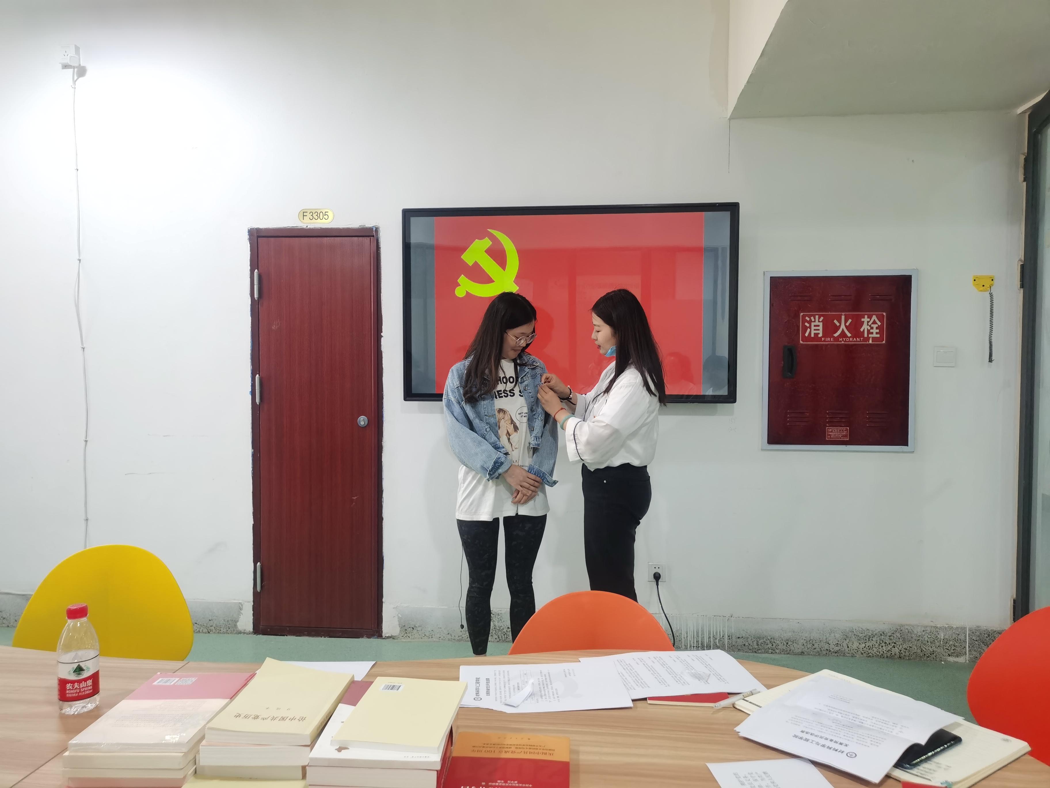 最后,经与会党员投票,8名同志均赞成发展朱子馨同学为中共预备党员。由支部书记王誉静同志为朱子馨同志佩戴党徽,并面对党旗庄严宣誓,全体党员也重温入党誓词,坚守入党初心。朱子馨同志表示,加入党组织内心很激动,佩戴党徽及宣誓入党誓词也很有仪式感。她表示自己一定会坚守入党初心,不断增强自己的理论知识与实践能力,将理论与实践相结合,更好的服务师生,发挥好党员的模范带头作用。