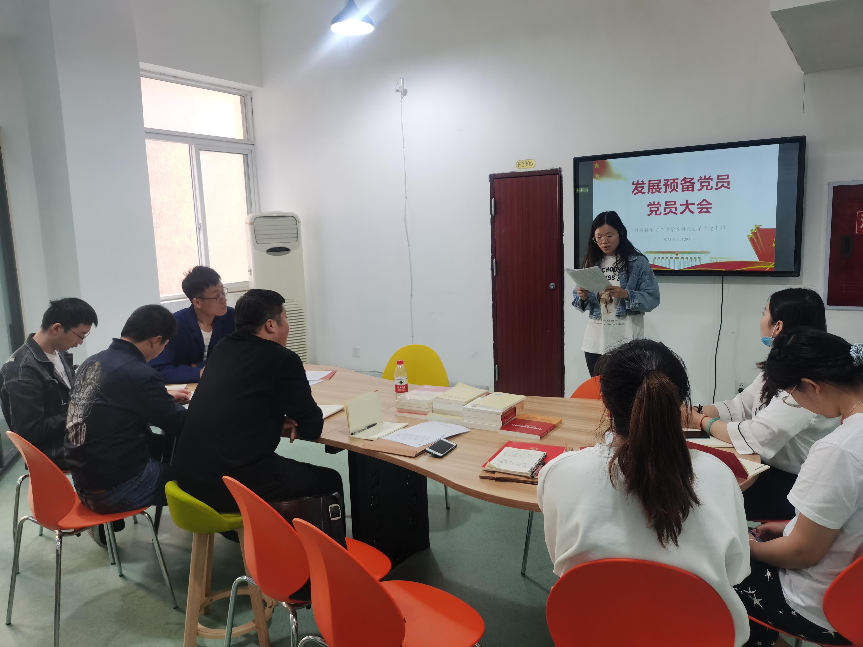 研究生第十党支部在九里校区三号楼J3318召开支部大会,会议由支部书记王誉静同志主持,支部党员同志参与,会议讨论表决是否同意发展朱子馨同学为中共预备党员。本支部共有党员10人,应到10人,实到8人,请假2人,符合发展预备党员大会召开条件。