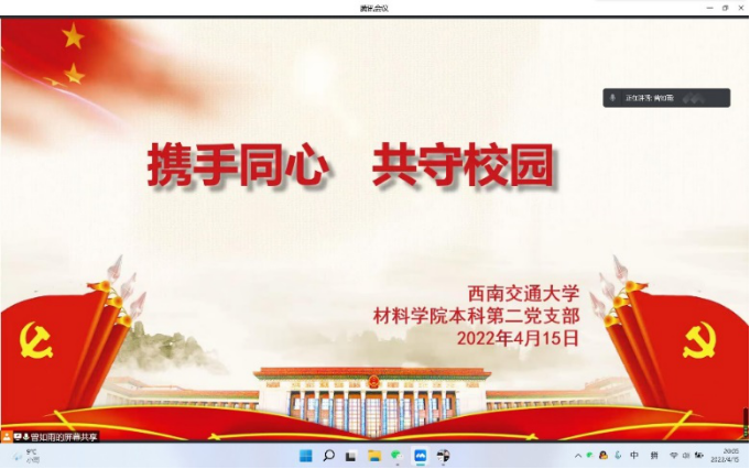本科生第二党支部线上开展了“携手同心 共守校园”主题党日活动。党支部书记郑纪伟领学“第一议题”——《习近平总书记在北京冬奥会、冬残奥会总结表彰大会上的讲话》。党支部委员曾如雨主持会议,并领学“始终坚持人民至上、生命至上”——习近平总书记指挥打好统筹疫情防控和经济社会发展之战述评。支部成员和入党积极分子共50余人参加。