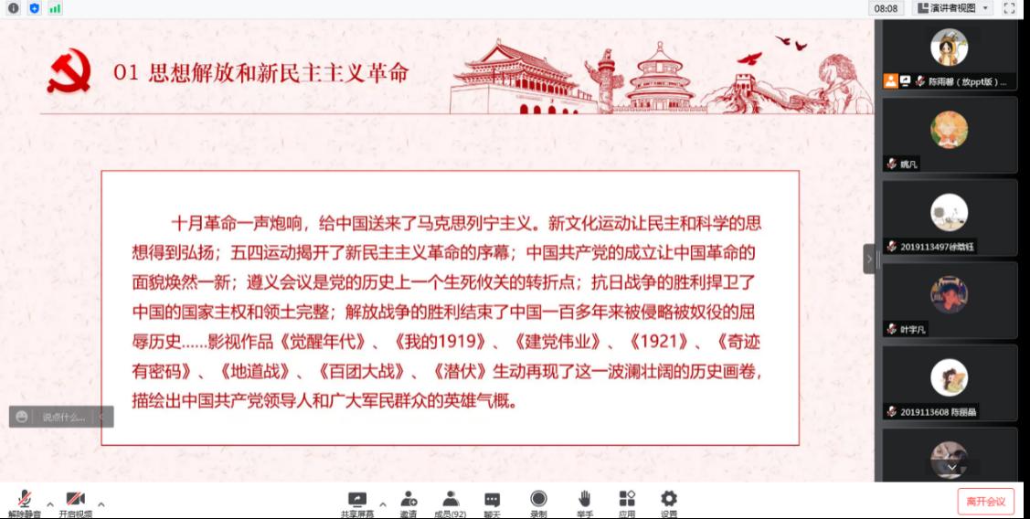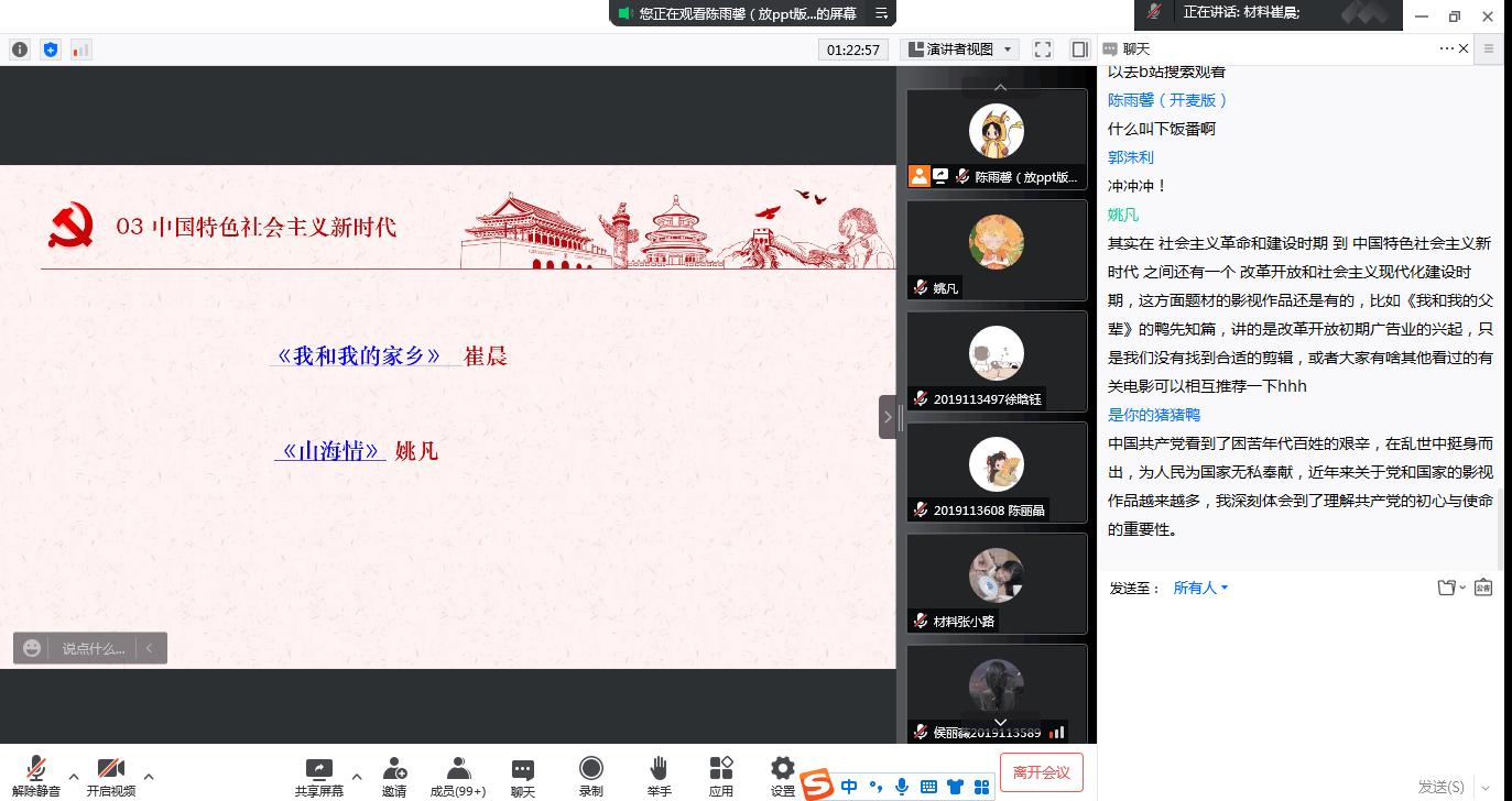 本科生第一(2019级)党支部于2022年5月19日19:30在线上面向全院学生举办了“重温红色经典,传承红色记忆”主题影视作品分享活动。本次影视作品分享会主要展现了新民主主义革命时期、社会主义革命和建设时期和中国特色社会主义新时代三个不同时期中国共产党人的奋斗历程,分享人带领大家见证了这段思想解放、民族崛起的漫漫奋斗征程。