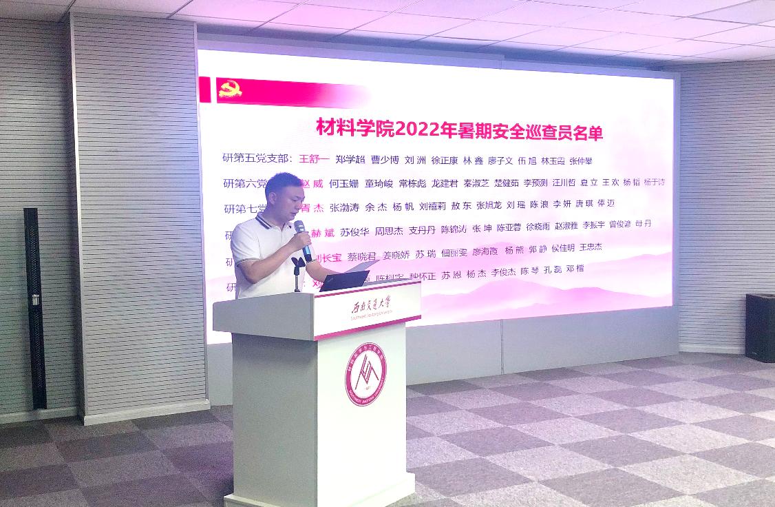 研究生的一员,要高度重视实验室安全工作,排除安全隐患是为了保障更好的学习与科研环境,他要求大家要不负自己党员的身份,要践行自己的承诺,巡查不能流于形式、流于表面,大家要担负起责任,认真对待巡查工作,同时此次活动也是对入党积极分子的考验,希望大家能有效结合党建工作将安全工作做深做细做实。最后,陈勇对本次工作提出了高度期待,希望通过暑期试点工作能够锻炼党员、发挥先遣队的作用,为之后的学院安全长效机制总结好的方法,培养好的队伍,建立好的制度,由点及面,将安全工作拓展到每位材料人、每个材料角落。