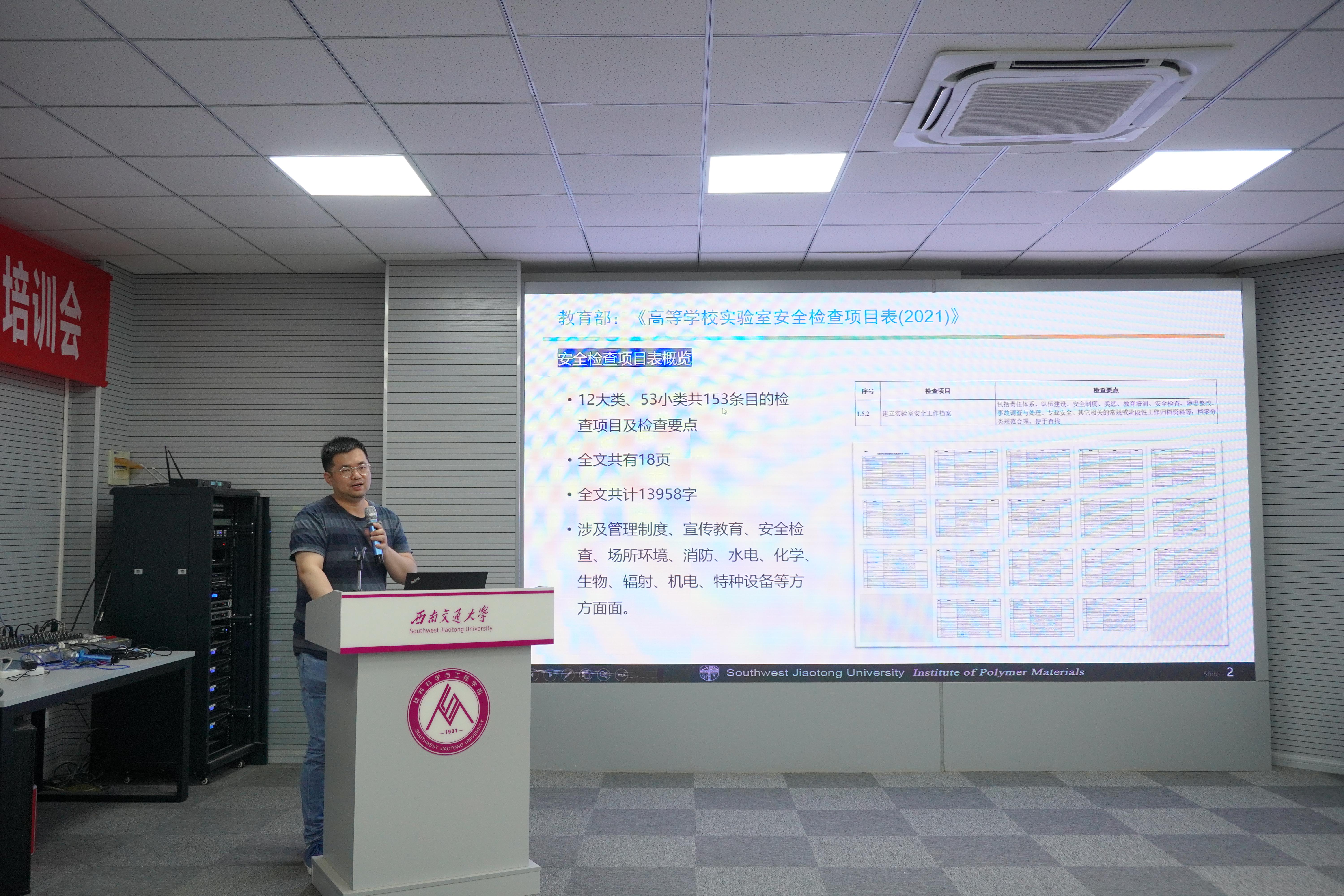 启动仪式结束后,韦炜老师对学生巡查队开展了安全巡查工作的培训,严格对照教育部制定的《高校实验室安全检查项目表(2022年)》的各项条款要求,并依据具体案例,从消防安全、化学安全、用电安全等多个方面讲解,详细介绍了检查工作的具体内容,提升巡查队员的安全意识和工作针对性认识。