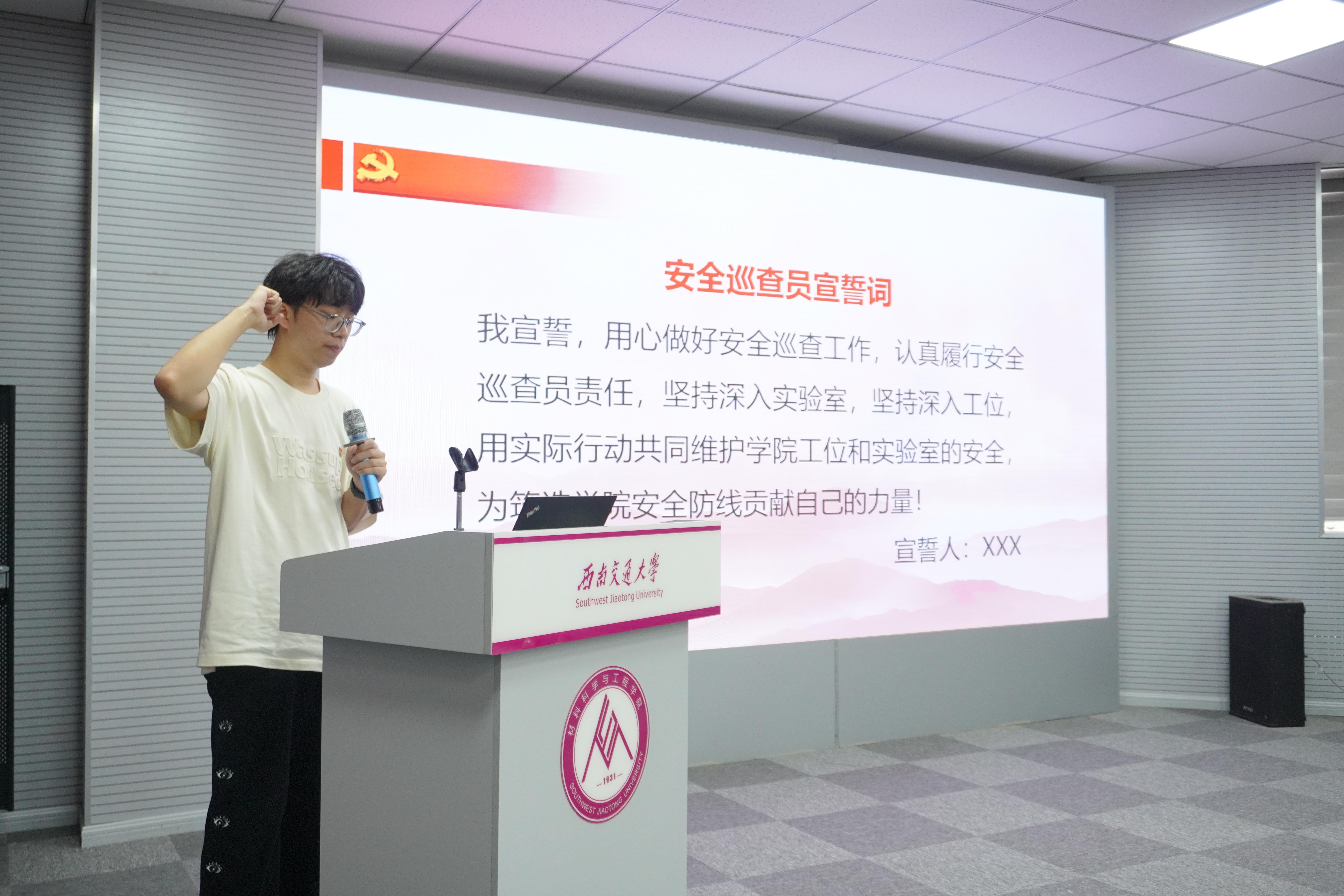 随后,全体安全巡查员宣誓。在宣誓环节,与会同学们满怀热情,由学生代表张旭龙领誓,学生巡查队成员全体宣誓:保证必将用心做好安全巡查工作,认真履行安全巡查员责任,坚持深入实验室,坚持深入工位,用实际行动共同维护学院工位和实验室的安全,为筑牢学院安全防线贡献自己的力量。宣誓完毕后,院领导为安全巡查员代表发放工作服,对同学们的积极参与表示高度赞扬并给予深切嘱托。