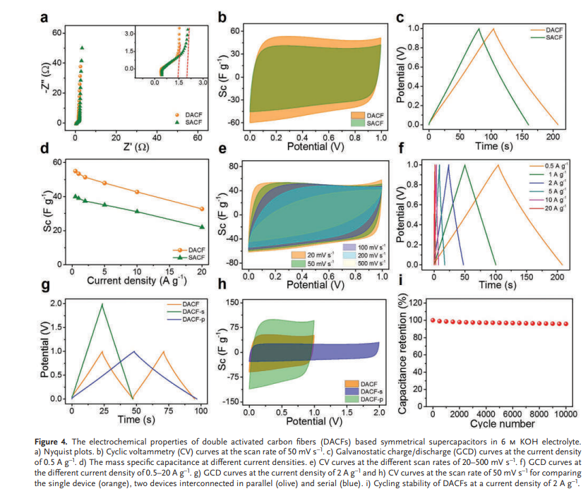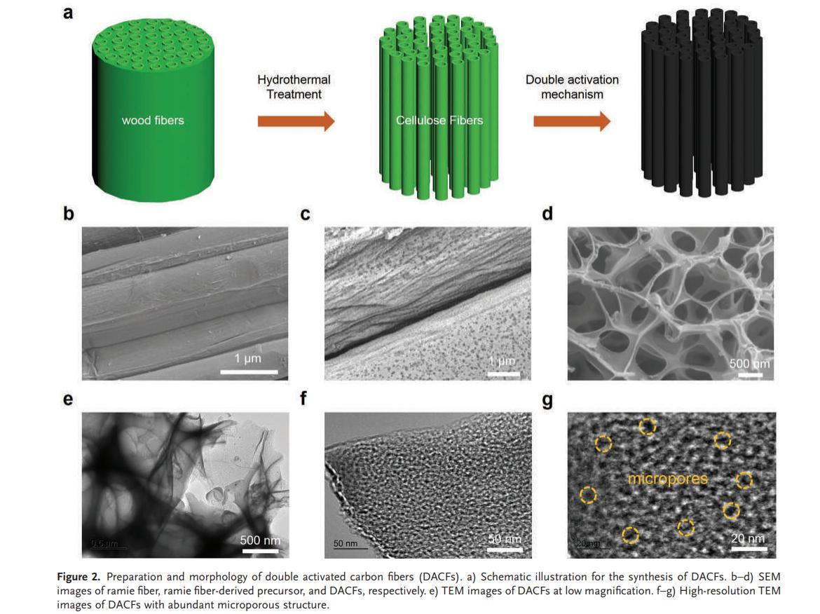 Rencently, a excellent work by Prof. Yang Weiqing, Zhang Haitao and Liu Yan have been pubilished at famous academic journal Advanced Functional Materials (IF=16.836). Here, a hierarchically divacancy defect building platform is reported for effectively biomass-transferred and highly interconnected 3D dual-activated porous carbon fibers (DACFs) based on the internal−external dual-activation function of the pre-embedded KOH and CO2 molecular. This uniquely interconnected frameworks not only fully provide the abundant active sites for ion interaction, but also efficiently guarantee the substantial accommodation for ion storage. Based on this, the as-prepared DACFs-based supercapacitors deliver a high energy density of 61.3 Wh kg−1 at a power density of 875 W kg−1 in the EMIMBF4 ionic liquid. This work not only provides a simple and efficient technique to enhance the energy density of carbon materials, but also probably promotes its additional application in environmental remediation.