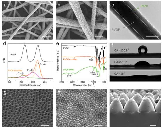 Figure 2. Characterization of hierarchical PVDF/PANI nanofibers and hierarchically patterned PDMS film.