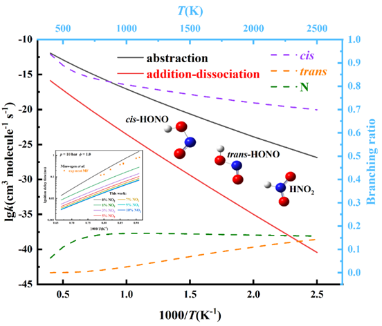废气再循环(EGR)广泛应用于现代内燃机中,以减少废气污染物并控制燃烧阶段。然而废气循环中除CO2、H2O和未燃碳氢化合物之外,还有少量的NO2。通过探究NO2与最简单的甲酸甲酯燃烧反应动力学,明确NO2浓度的增加能够缩短所有温度范围内的着火延迟时间,且促进作用与NO2浓度呈现非线性关系(图3)。相关成果以“Exploring the reaction kinetics of methyl formate + NO2: Implication for ignition behavior of methyl formate/NO2 mixtures”为题发表在Physical Chemistry Chemical Physics上。