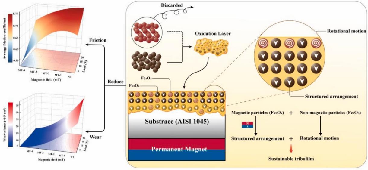 本研究揭示了磁场在减少摩擦与磨损中的关键作用,助力低能耗生产进程。通过深入分析磁场诱导摩擦膜形成的机制,研究指出磁场能够有效改变摩擦界面的摩擦学行为,增强机械耐久性。实验结果表明,磁场不仅能通过调控磨损颗粒的氧化和摩擦膜的结构提高抗磨性能,还能显著降低摩擦系数和磨损体积。磁场强度的调控为摩擦界面的摩擦与磨损行为提供了一个环保、可控的解决方案,展示了磁场与摩擦学之间复杂而密切的相互作用,为未来的摩擦学系统设计和优化开辟了新的方向。