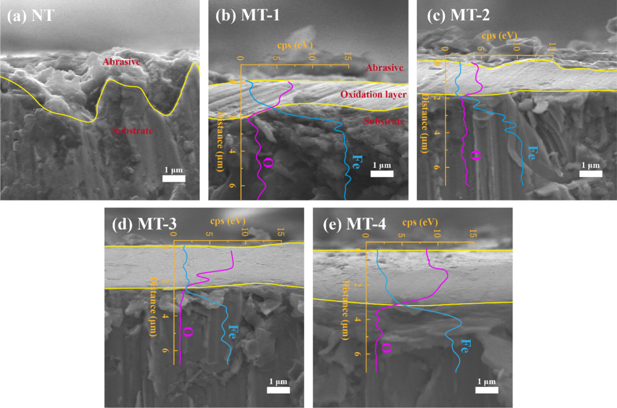 最后,作者通过图5展示了不同磁场强度下磨损表面的截面形态及元素分布变化。在无磁场作用下(图a),磨损轨迹中充满不规则的碎屑,且未出现明显的分层现象。随着磁场强度的增加(图b-e),氧化层的厚度显著增加,从2微米增加至3微米,且碎屑的体积减小,变得更加精细。磁场刺激促进了碎屑的氧化,形成了致密的氧化膜,增强了表面硬度和耐磨性,有效保护了基体表面,减少进一步的磨损。这些结果表明,磁场不仅能细化碎屑,还能通过促进氧化膜的生成来提高抗摩擦和耐磨性能。