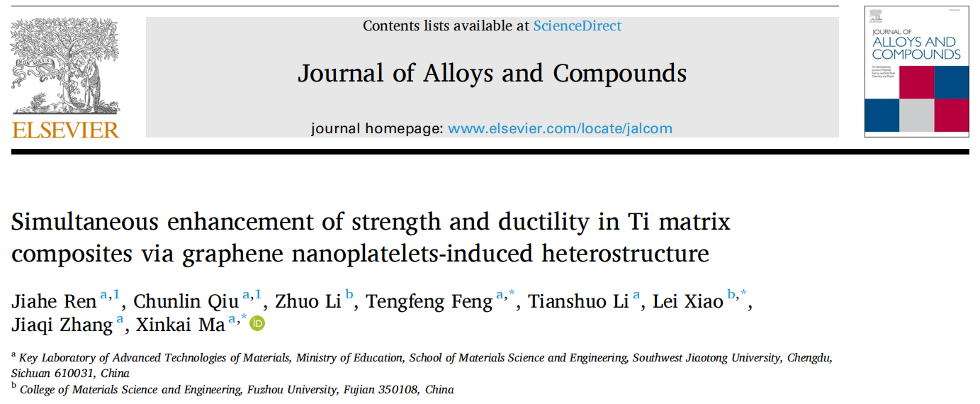 2022级本科生任嘉贺、邱春林、李天朔在Journal of Alloys and Compounds(中国科学院二区SCI期刊,JCR 1)发表了题为“Simultaneous enhancement of strength and ductility in Ti matrix composites via graphene nanoplatelets-induced heterostructure”的论文,论文通讯作者为包子漫画